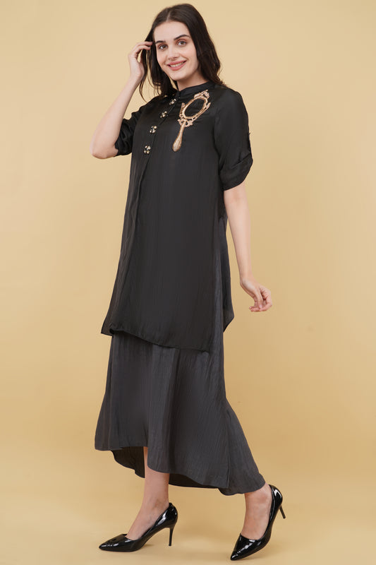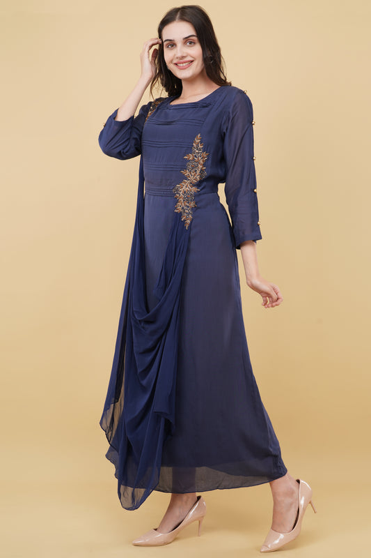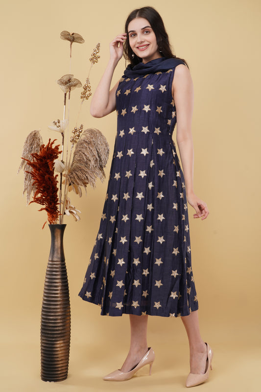 Navy Blue Cowl Neck Star Motif Straight Cut Dress