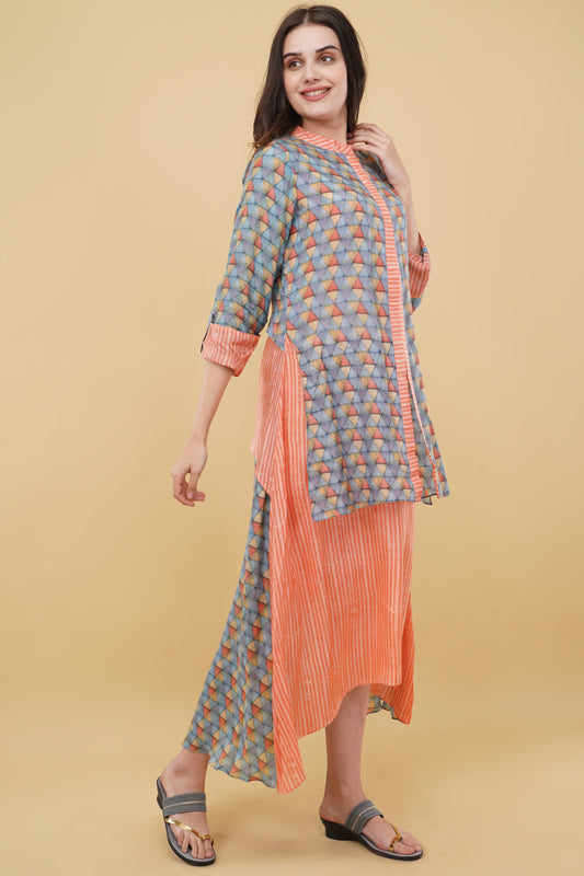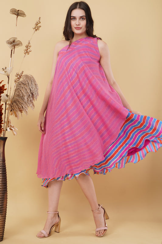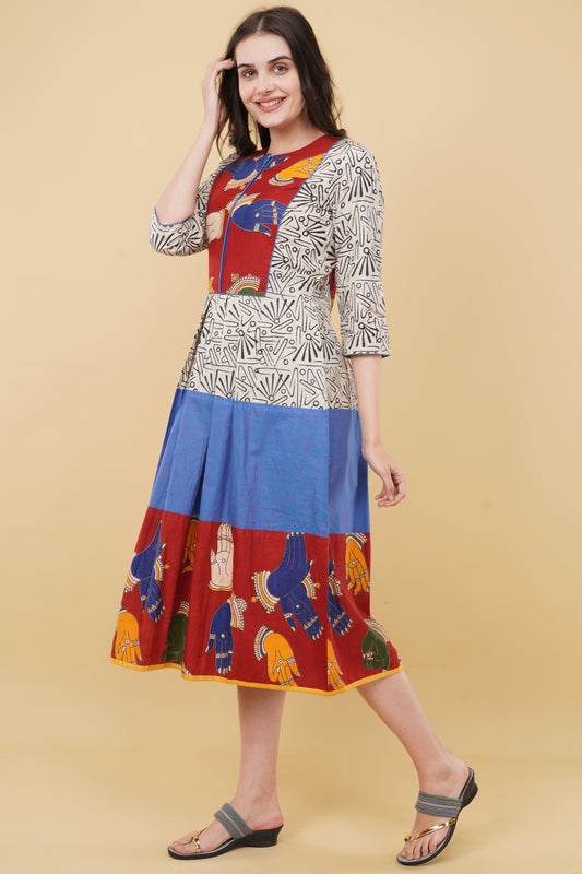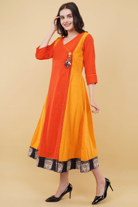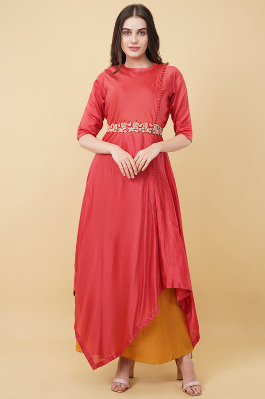 Red and Yellow Flared Asymmetrical Dress with Tassles Belt