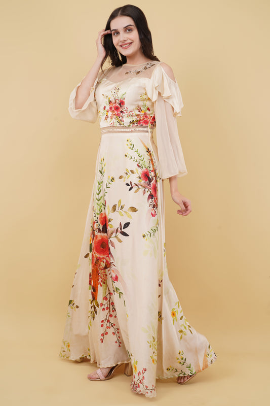 White Cold-Shoulder Padded Straight Cut Floral Printed Dress