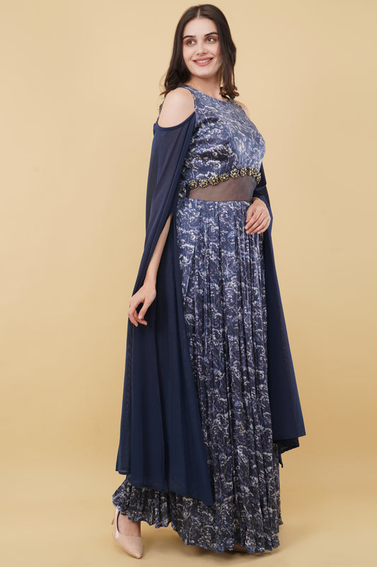 Blue Cape Sleeves Padded Straight Cut Forest Printed Dress