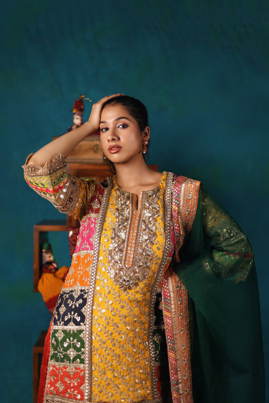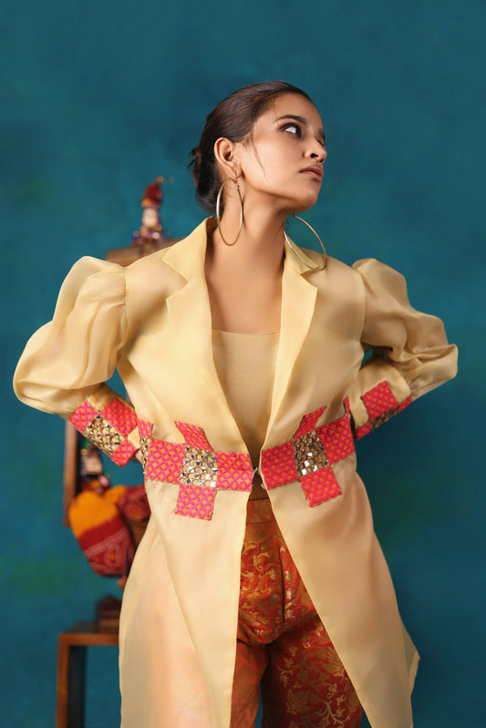 Yellow Jacket, Bustier and Orange Brocade Pants Set