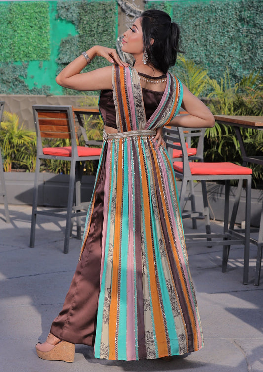 Embellished Kaftan with Brown Bustier and Pants Set