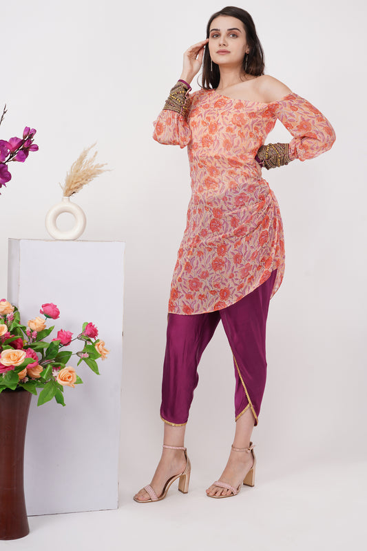 Coral Floral One-Shoulder Tunic Set