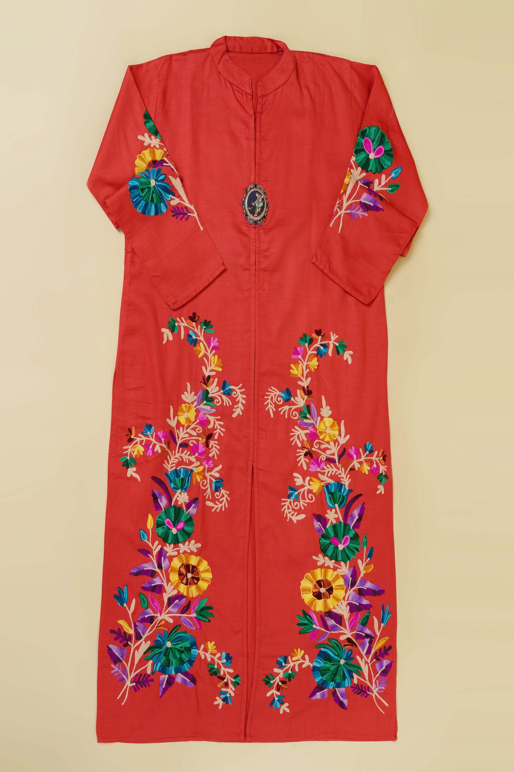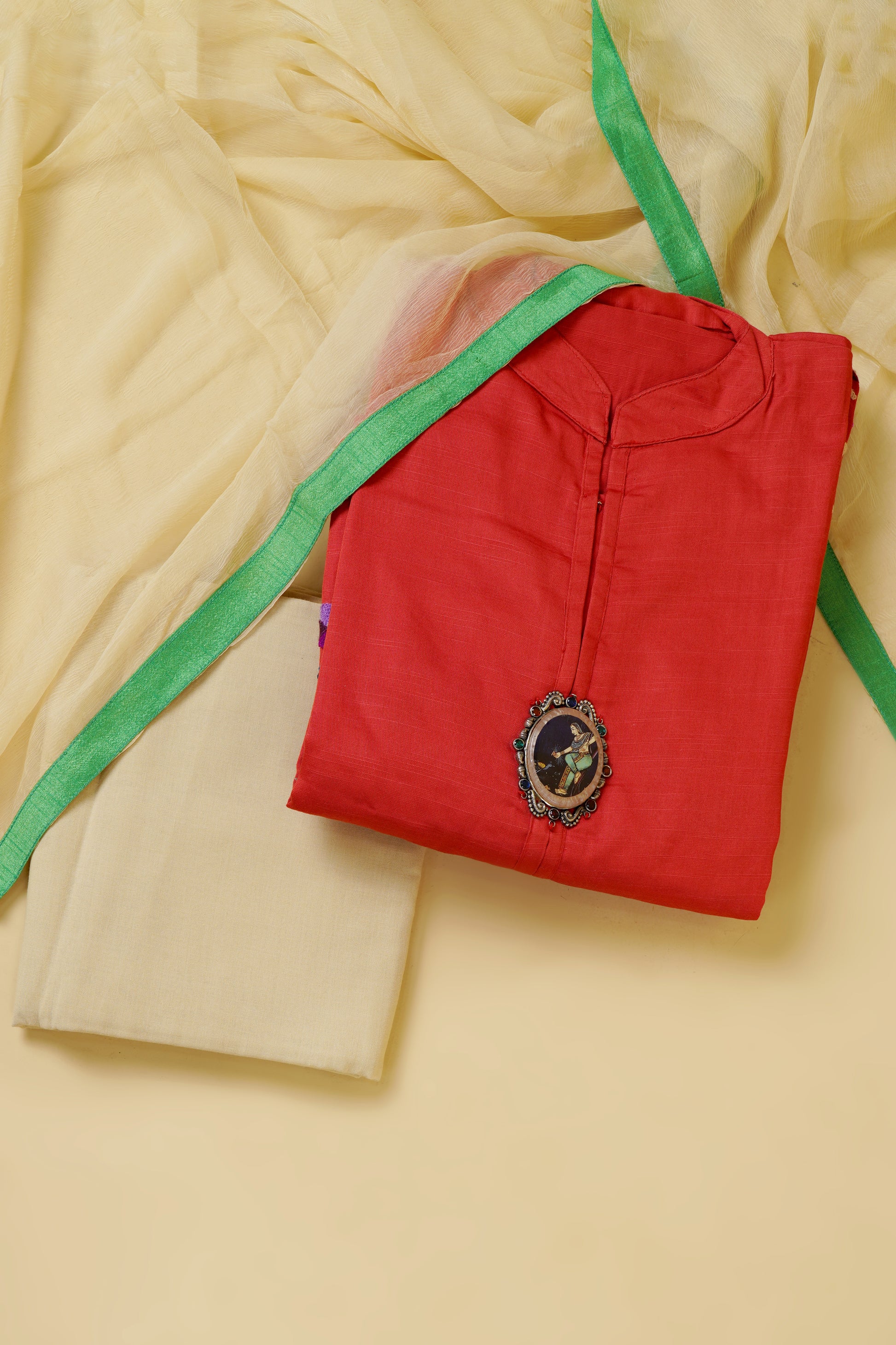 Description: The Red and Beige Unstitched Suit Piece features a red kurta piece adorned with Rani motif buttons. Paired with a beige lower, it comes with a beige dupatta highlighted by a green border.