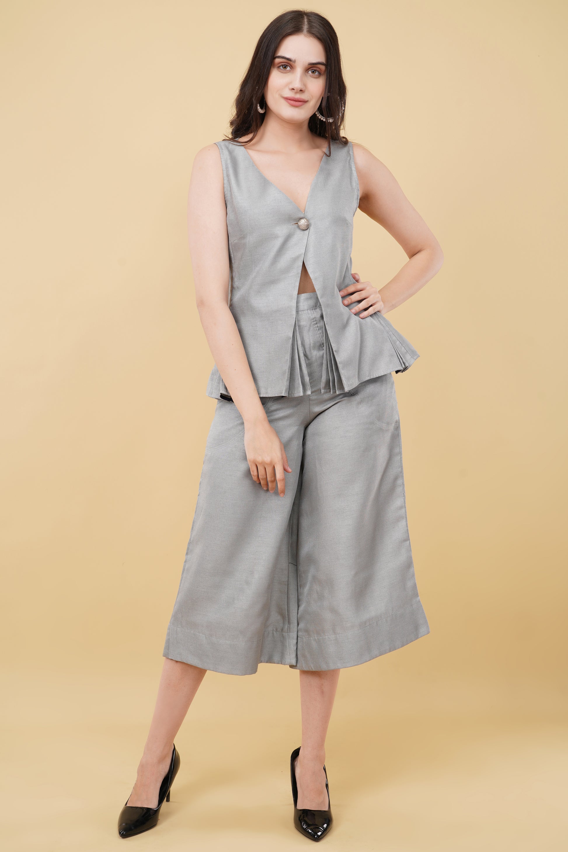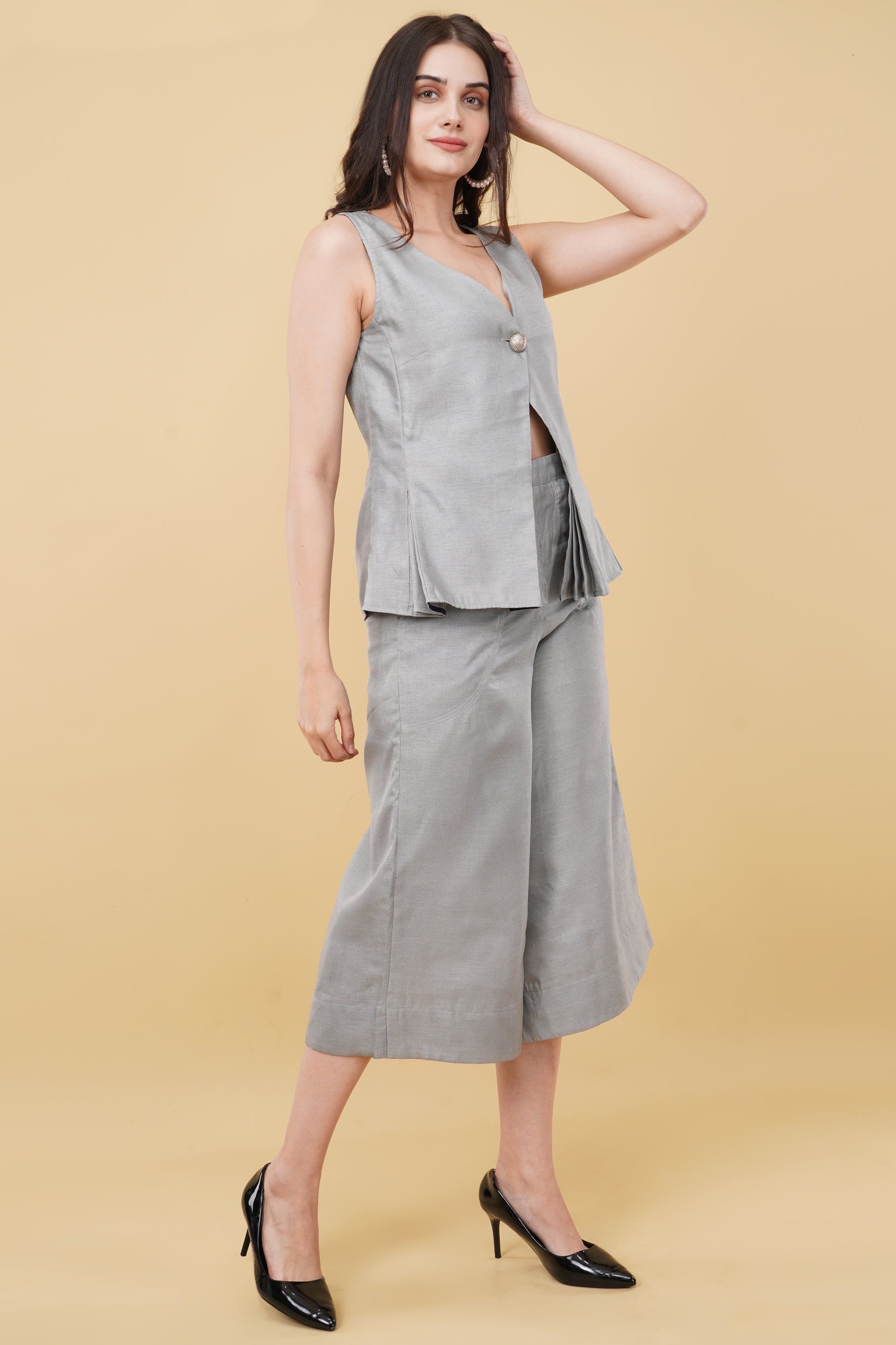 Description: Solid Grey Co-ord Set, made from durable poly jute fabric, this co-ord set features a solid grey color waistcoat top and short pants.