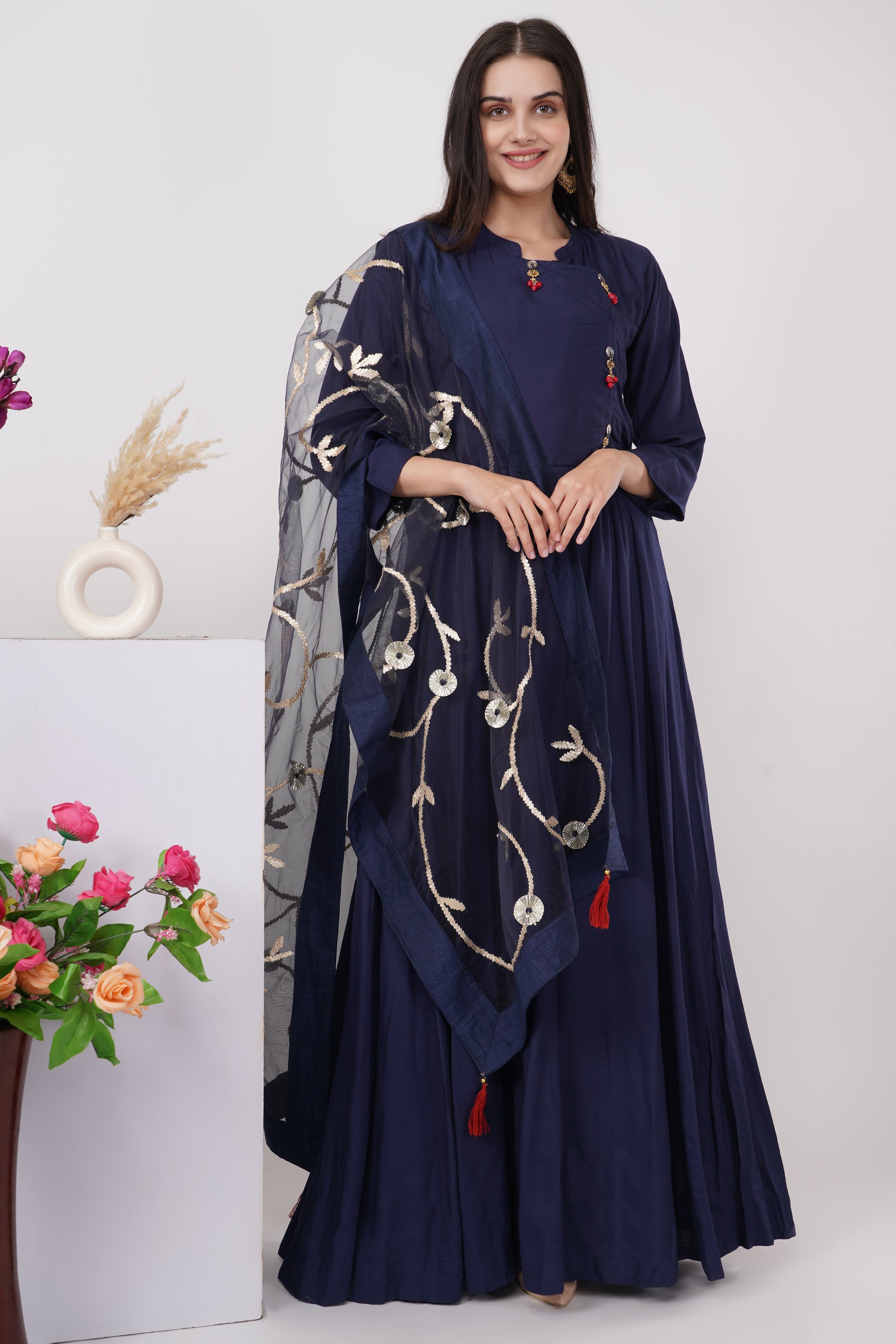 The Solid Navy Blue Kurta Set includes a full-length kurta dress made from cotton silk and an embroidered net dupatta.