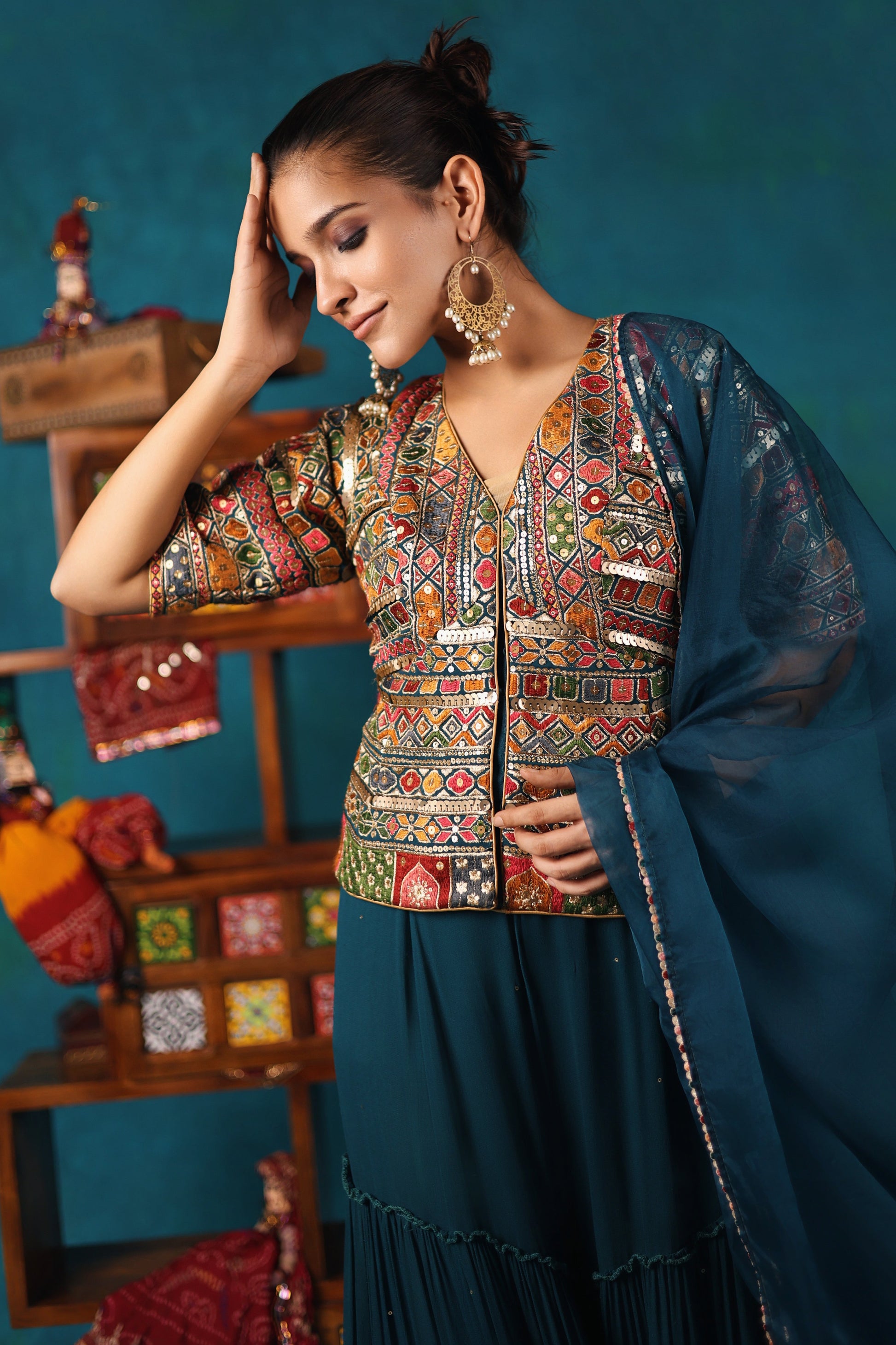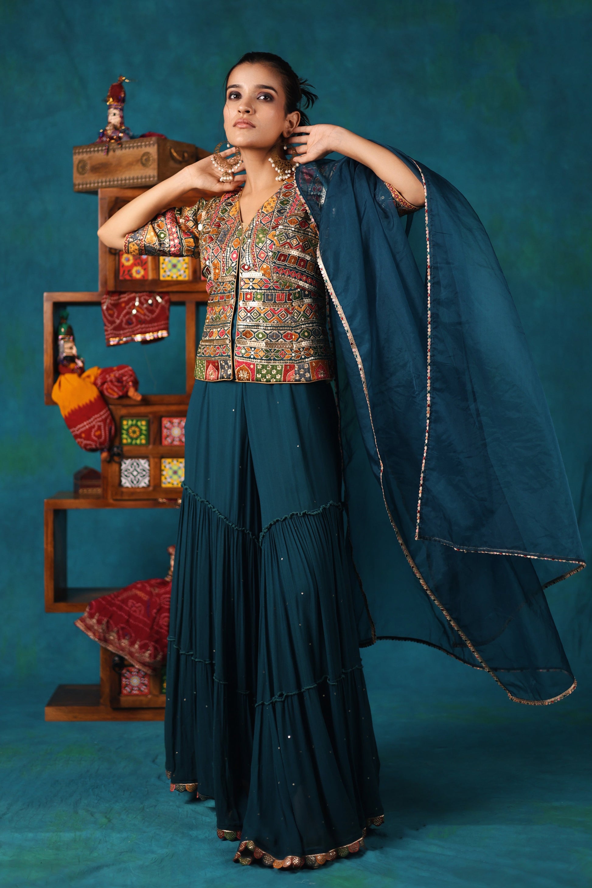 The Teal and Multicolour Embroidered Corset Jacket Top features intricate embroidery and is paired with a layered viscose georgette gharara with lace detailing. The ensemble is completed with a viscose organza dupatta adorned with lace accents, creating a graceful and elegant look.