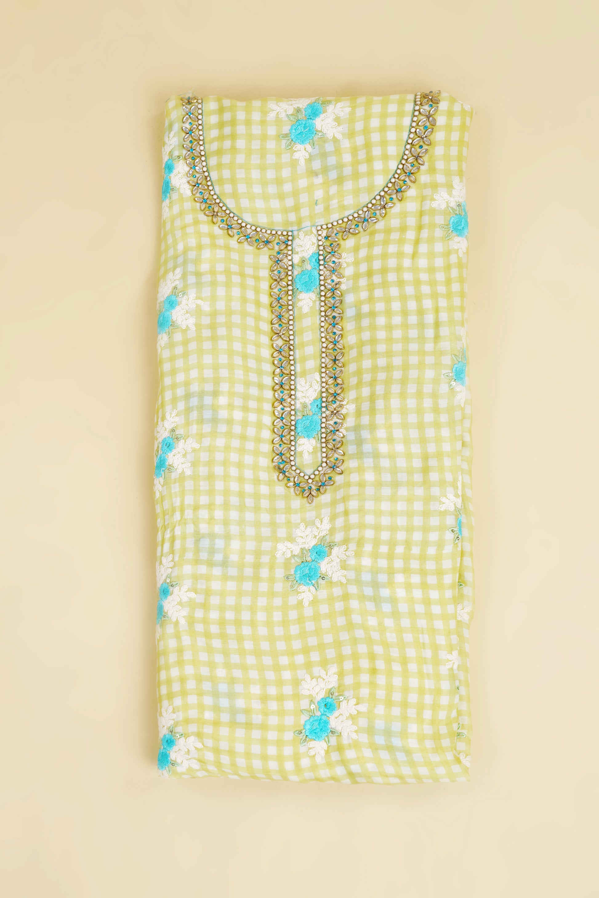 The Yellow Checkered and Aqua Blue Unstitched Suit Piece presents a charming blend with its yellow checkered kurta fabric adorned with aqua blue embroidered floral motifs. It is paired with an aqua blue lower piece and a matching aqua blue dupatta.